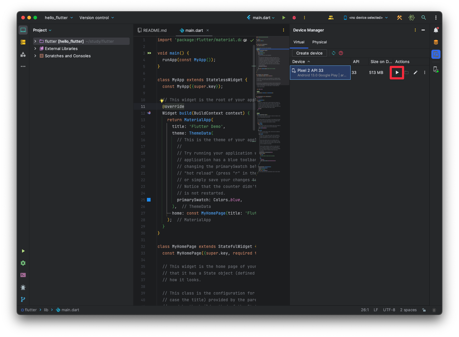 Flutter app을 실행하기 위해 우선 Device를 실행합니다.