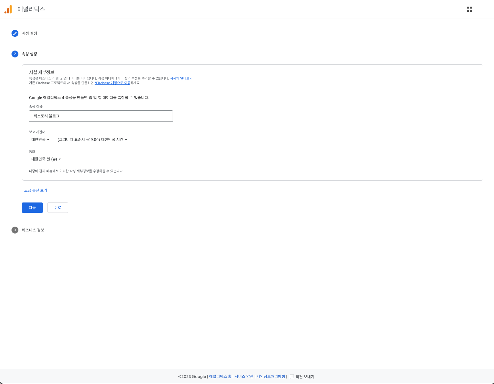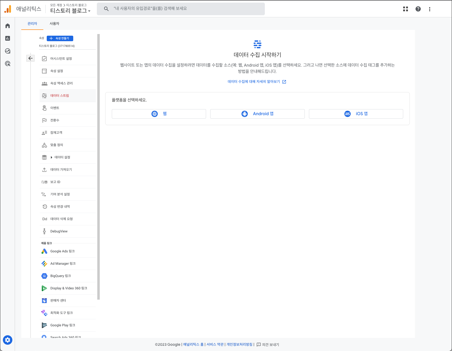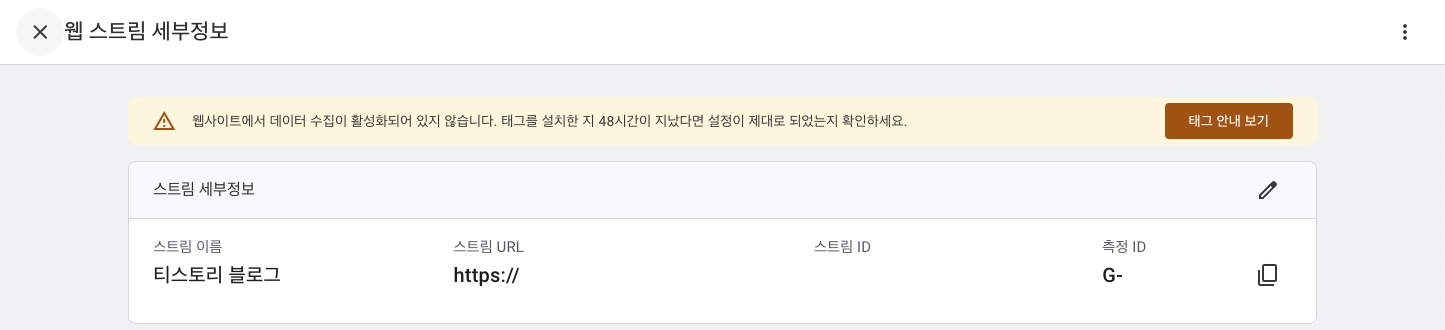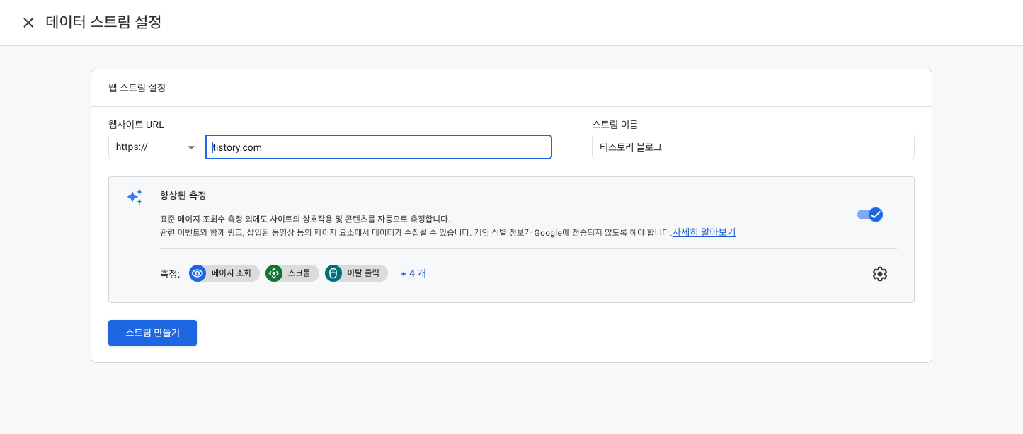 데이터 스트림 설정에서는 웹사이트 URL은 블로그의 URL을 기입하고, 스트림 이름을 티스토리 블로그로 설정하였습니다.