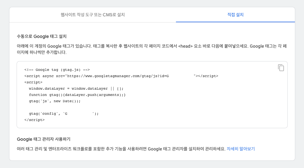 Google 애널리틱스 - Google 태그 설치하기 - 직접설치의 코드를 복사합니다.