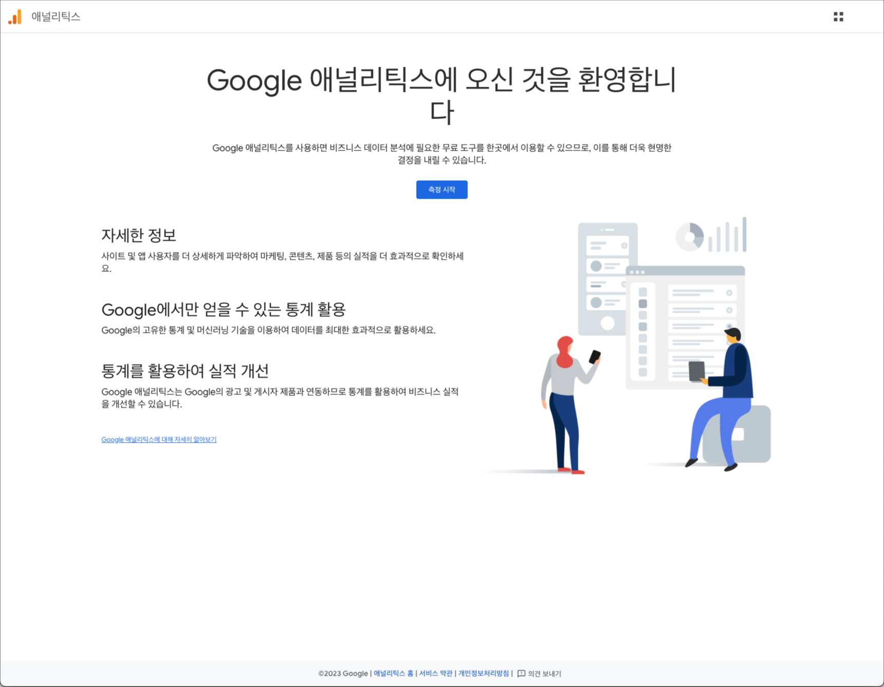 Google 애널리틱스에 접속하여 측정 시작버튼을 클릭합니다.