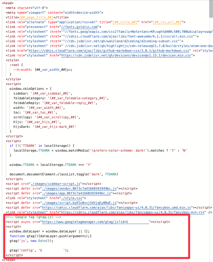 복사한 스크립트를 블로그 html 편집의 <head> </head> 영역 사이에 붙여 넣으면 됩니다.