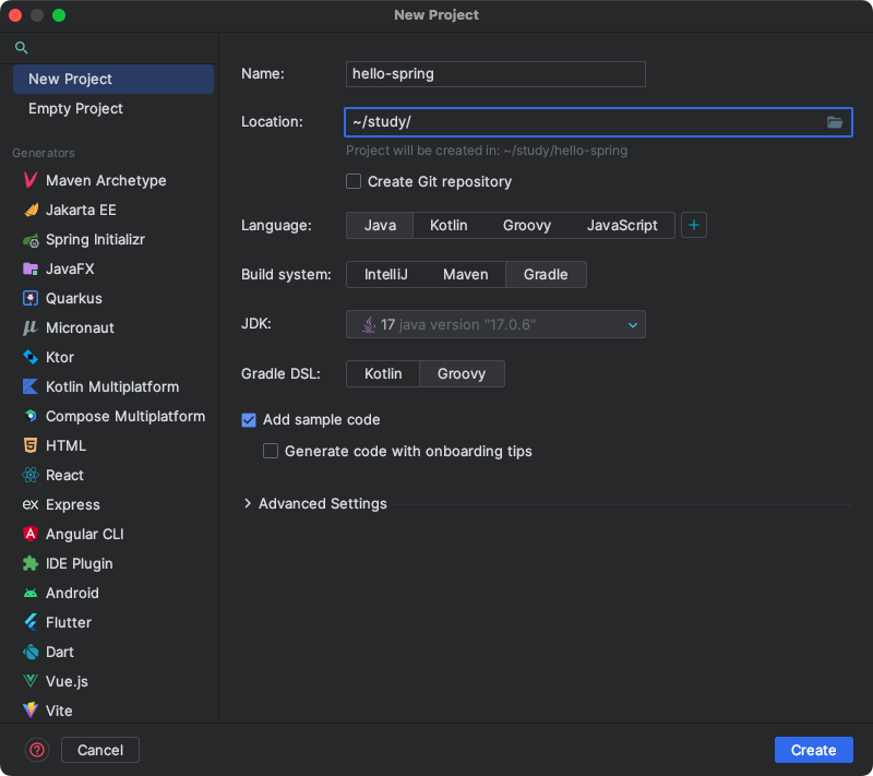 Build는 Maven이 아닌 Gradle로 설정하며 Gradle DSL은 Groovy를 선택하였습니다.